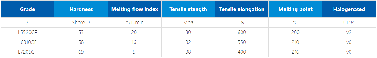 GradeHardnessMelting flow indexTensile stengthTensile elongationMelting pointHalogenated