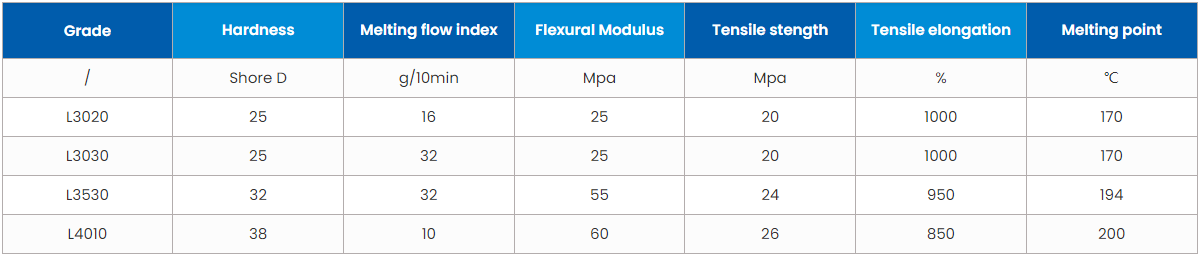 GradeHardnessMelting flow indexFlexural ModulusTensile stengthTensile elongationMelting point