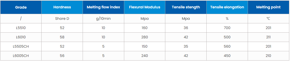 GradeHardnessMelting flow indexFlexural ModulusTensile stengthTensile elongationMelting point